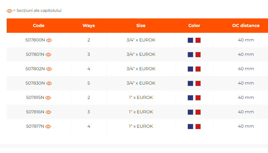 · Colector modular seria EASY LOCK (distanță centru-centru 40 mm) cu supape de izolare acționate manual și placă reversibilă (cald / rece) care arată elementul conectat la ieșirea corespunzătoare.